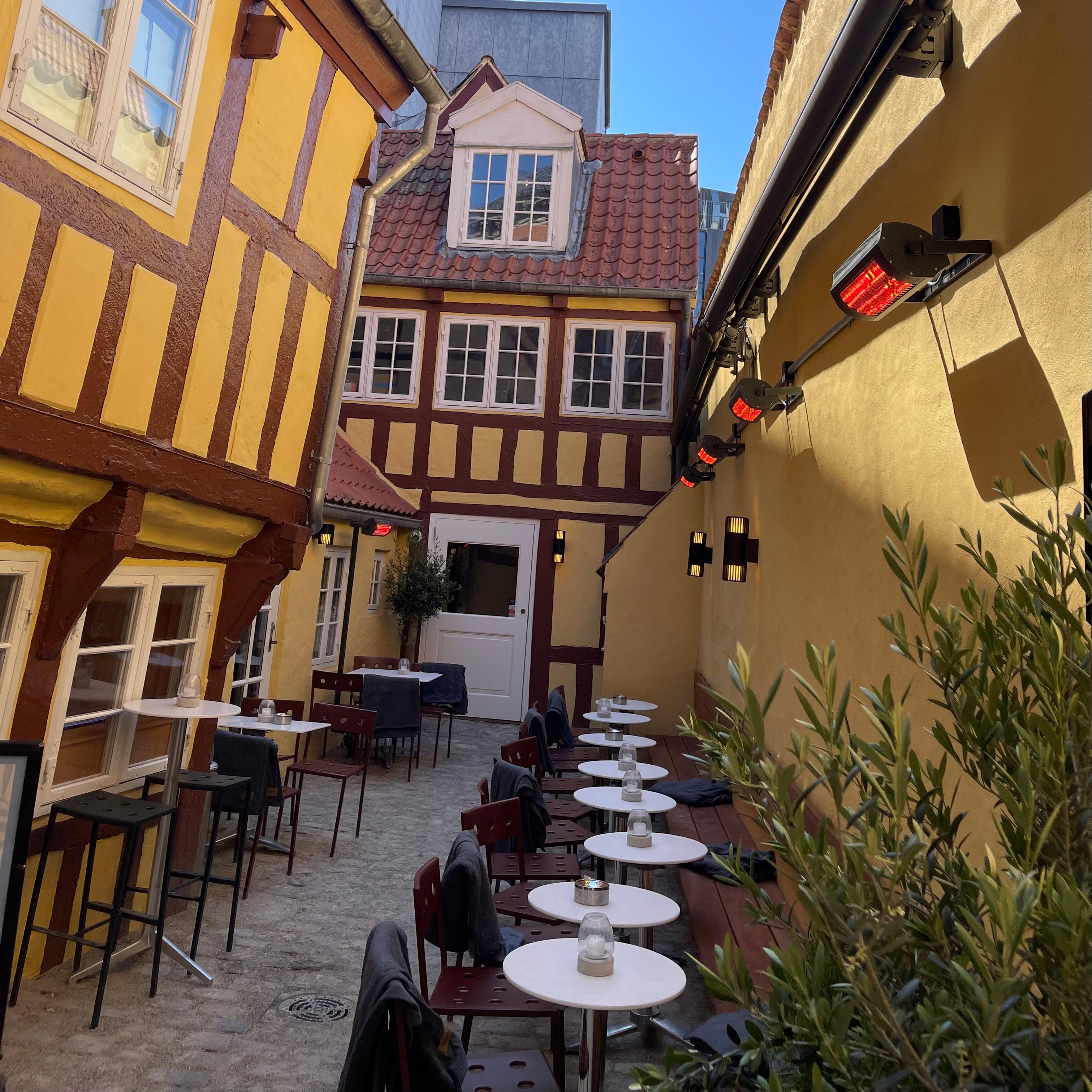 Hos os kan du slå dig ned i baren, som er indrettet i Aarhus’ ældste tilbageværende bygning, der daterer sig helt tilbage til 1540. Du kan også nyde vores to stemningsfulde udendørsområder – foran bygningen på Vestergade såvel som i vores charmerende, gamle bindingsværks baggård.